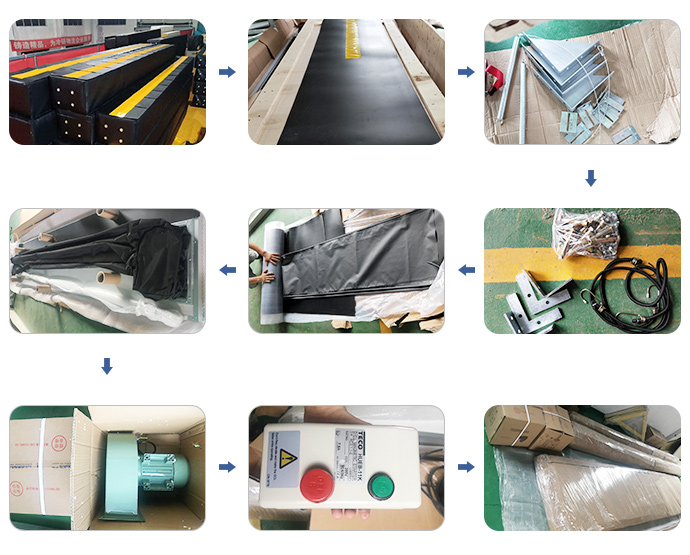 有頂部密封柱和兩個側(cè)密封柱。該材料為氯丁橡膠合成織物,密封柱為連續(xù)的圓柱形,由外部鼓風機連續(xù)充氣,各部分設(shè)有平衡孔。因此,整個工作狀態(tài)將緊緊地包裹著卡車車廂。達到密封效果。